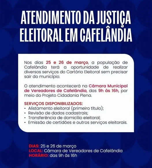 PorVinicius Cardoso23 de março de 2026Atenção, população de Cafelândia! Nos dias 25 e 26 de março, a comunidade terá a oportunidade de acessar diversos serviços da Justiça Eleitoral...