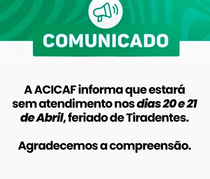 A ACICAF informa que não haverá atendimento nos dias 20 e 21 de abril, em razão do feriado de Tiradentes. Retornaremos normalmente após...