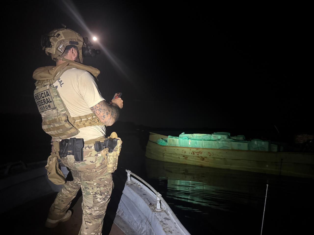 No local, os policiais apreenderam a embarcação de aproximadamente 7 metros, o motor de 200HP e cerca de 120 caixas de cigarros, totalizando aproximadamente 60 mil maços. Todo o material foi encaminhado à Receita Federal.