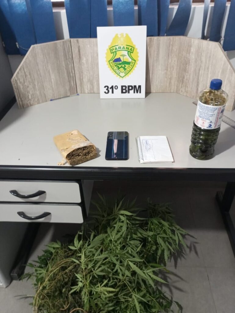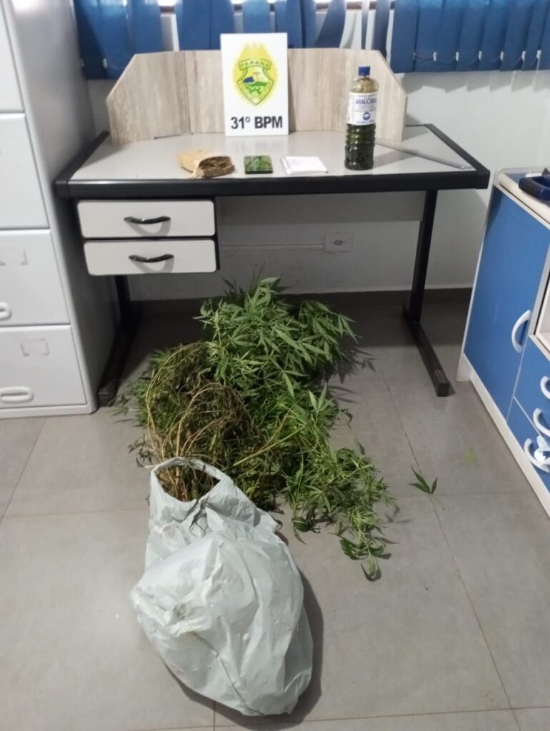 A polícia foi até o local e realizou abordagem ao indivíduo, quando ele foi no vestiário para tirar o uniforme da empresa, a polícia localizou dentro do armário um vidro de álcool contendo dentro um tronco de maconha.