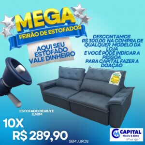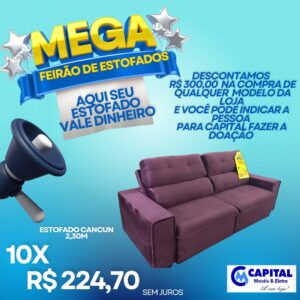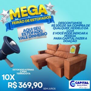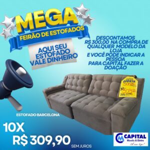 “Nós da Capital Móveis e Eletro ressaltamos que o seu estofado usado tem valor, pegamos o seu estofado pelo preço de R$ 300,00 reais , mediante a sua compra de outro estofado, e o melhor você ainda pode escolher para quem a Capital vai doar o seu usado”.