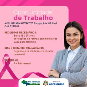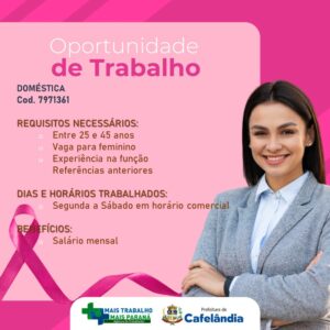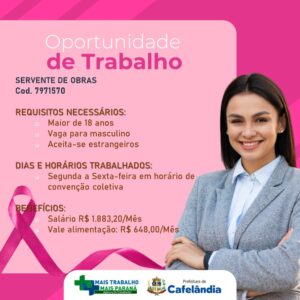 Agência do Trabalhador de Cafelândia esta com diversas vagas de emprego, entre elas de Doméstica, Auxiliar administrativo, Auxiliar de serviços de alimentação, Pedreiro oficial, Servente de obras e Assistente administrativo.
