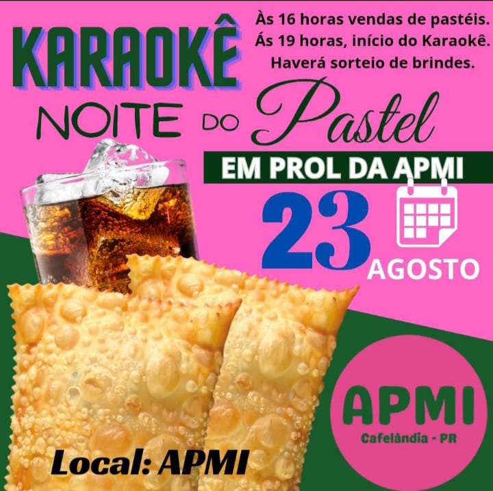 Neste próximo sábado dia 23 de agosto a APMI de Cafelândia irá promover um evento mais que especial, que inclui noite do Pastel e Karaokê.