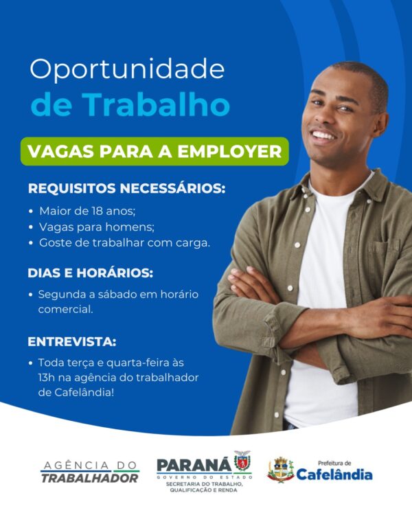 PorVinicius Cardoso5 de novembro de 2025Agência do Trabalhador de Cafelândia esta comunicando que nesta terça-feira dia 04 de novembro acontecerá entrevistas para a Employer, ás 13 horas. Se...