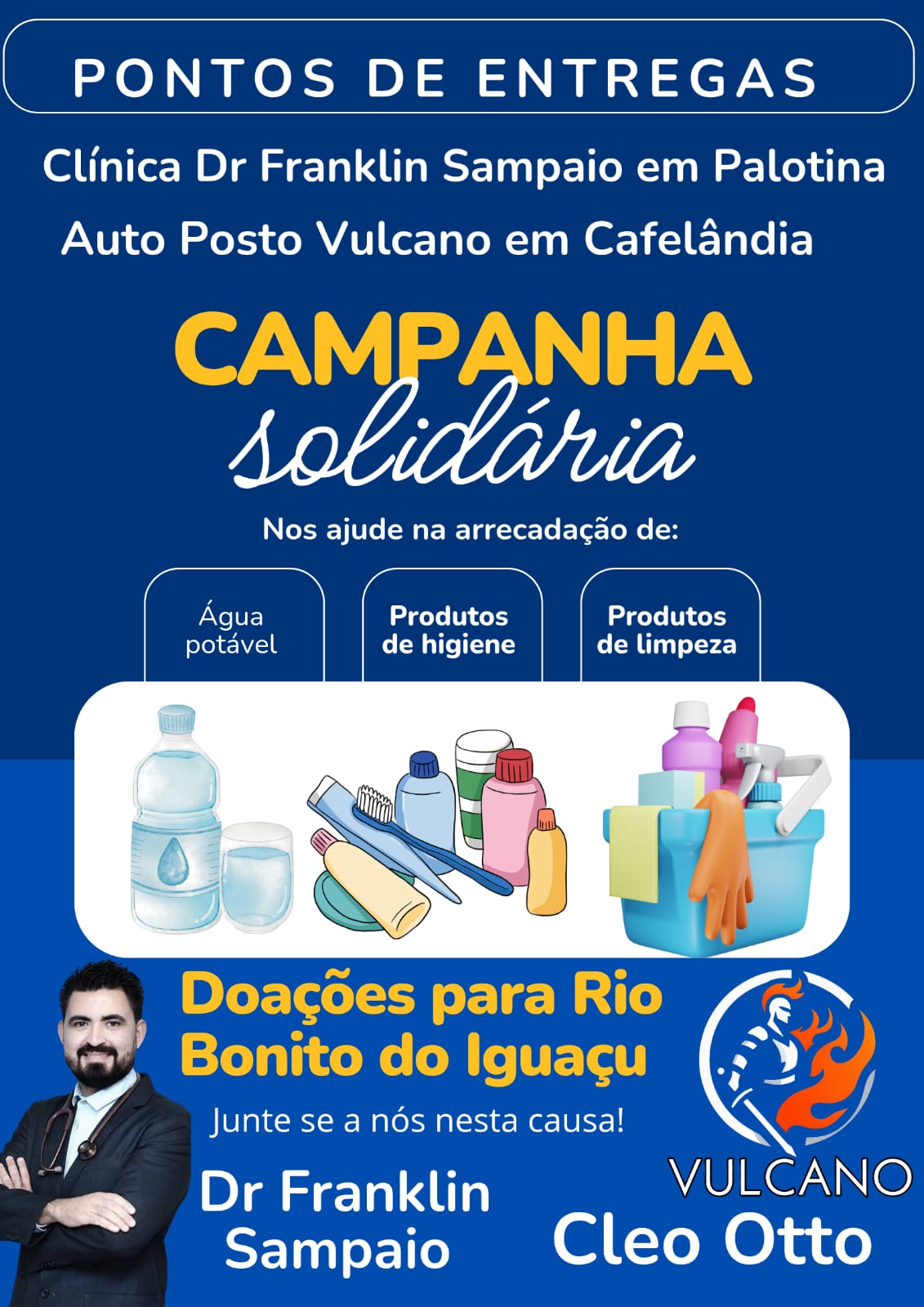 O Auto Posto VULCANO de Cafelândia e a Clínica Dr. Franklin Sampaio de Palotina unem forças em uma importante campanha para auxiliar as famílias afetadas pelo vendaval que devastou Río Bonito do Iguaçu. Estamos arrecadando água potável, produtos de higiene e limpeza para amenizar o sofrimento daqueles que perderam tudo.
