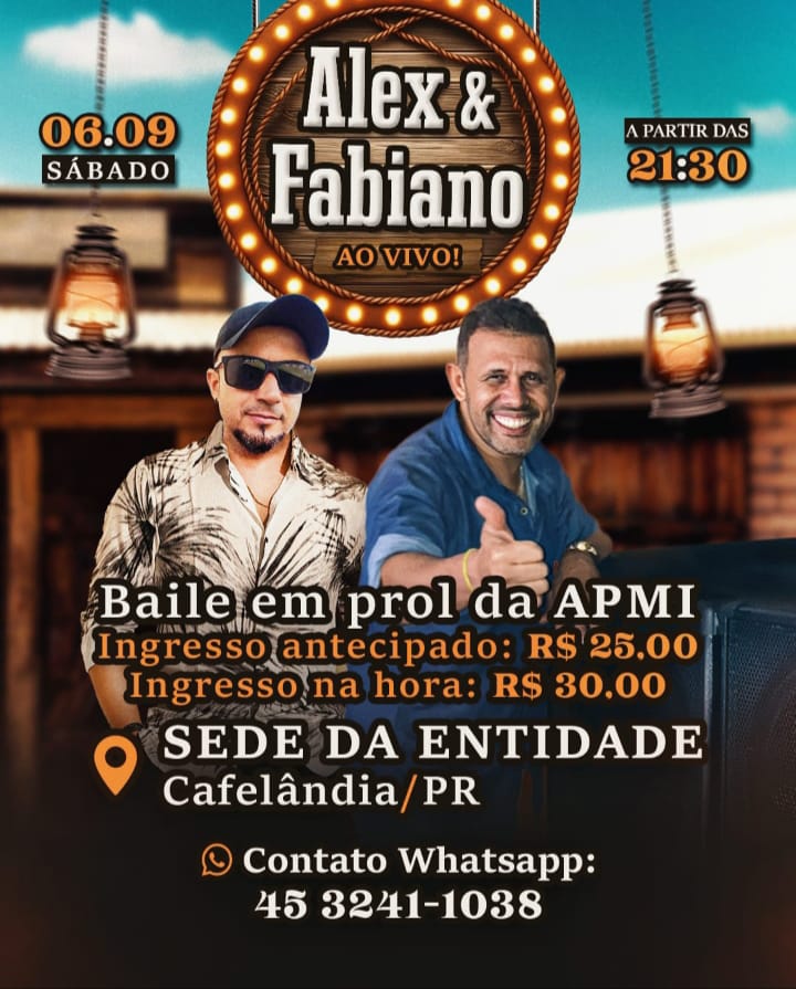Prepare-se para uma noite animada! No dia 06 de setembro, a APMI de Cafelândia realizará um baile especial. Com a animação da renomada dupla Alex e Fabiano, o evento promete ser uma celebração cheia de música e alegria.