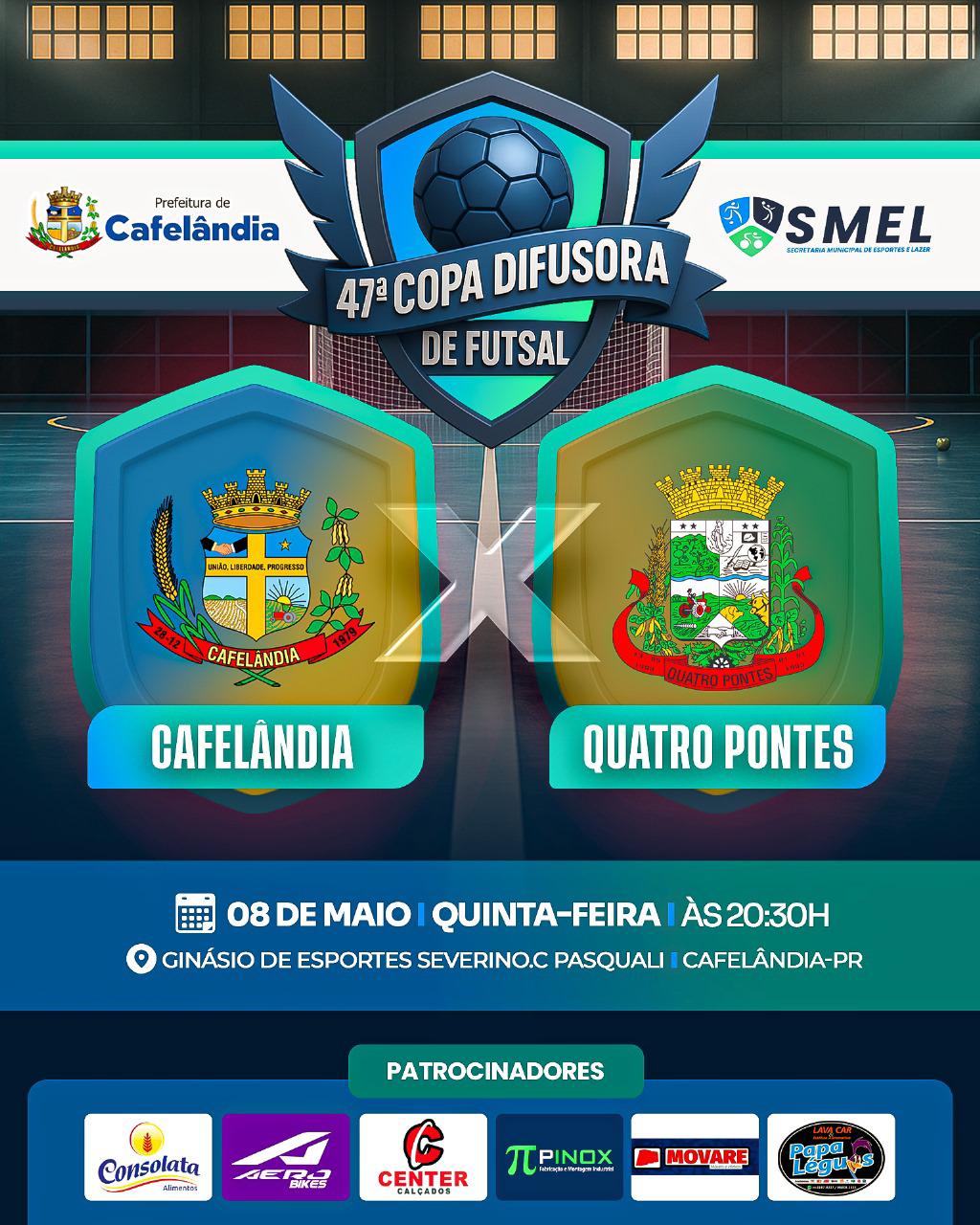 A equipe de futsal masculino de Cafelândia faz sua estreia na tradicional 47ª Copa Difusora de Futsal nesta quinta-feira, dia 08, a partir das 20h30, no Ginásio de Esportes Severino Pascoali. O adversário da noite será o time da cidade de Quatro Pontes.