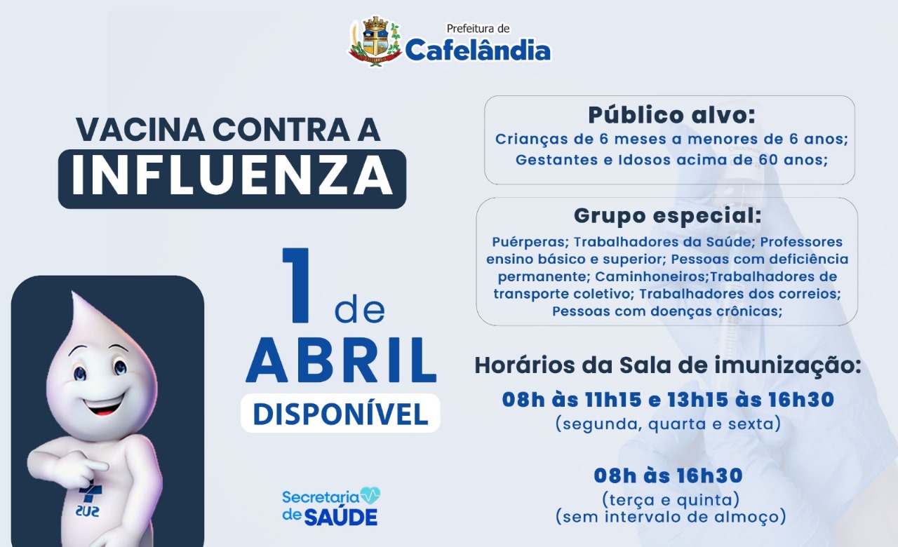 A Secretaria de Saúde de Cafelândia deu início, nesta terça-feira (1º), à campanha de vacinação contra a Influenza. A imunização tem como objetivo proteger a população contra o vírus da gripe, prevenindo complicações, internações e óbitos decorrentes da doença.