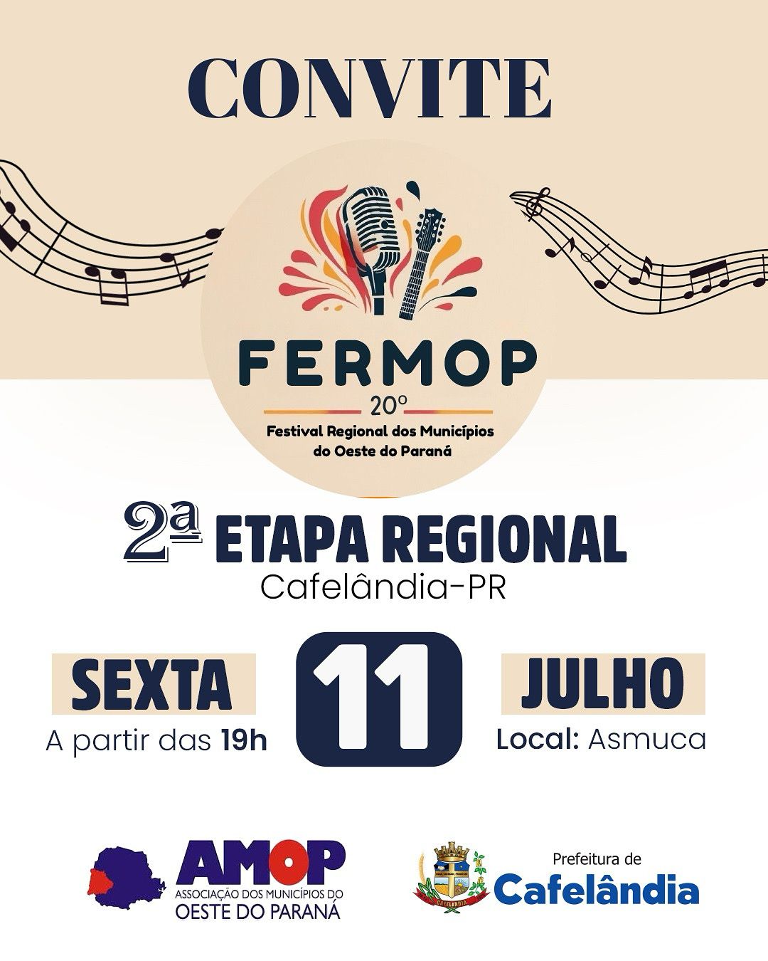 Realizado pela AMOP – Associação dos Municípios do Oeste do Paraná, com o apoio da Prefeitura de Cafelândia, o Fermop é um dos mais importantes eventos culturais da região, reunindo talentos musicais de diversos municípios em uma grande celebração da música e da cultura local.