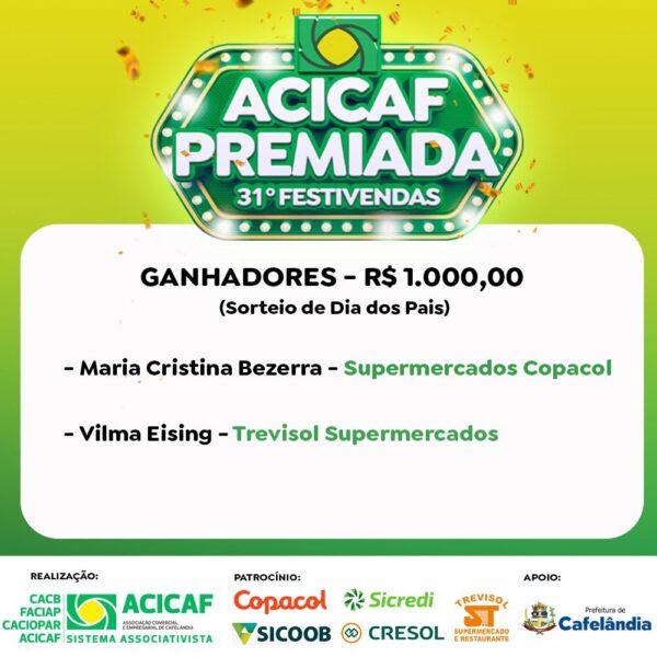 PorVinicius Cardoso26 de agosto de 2024Na última quarta-feira, 21, a equipe da ACICAF – Associação Comercial e Empresarial de Cafelândia divulgou os ganhadores do primeiro sorteio do 31º...