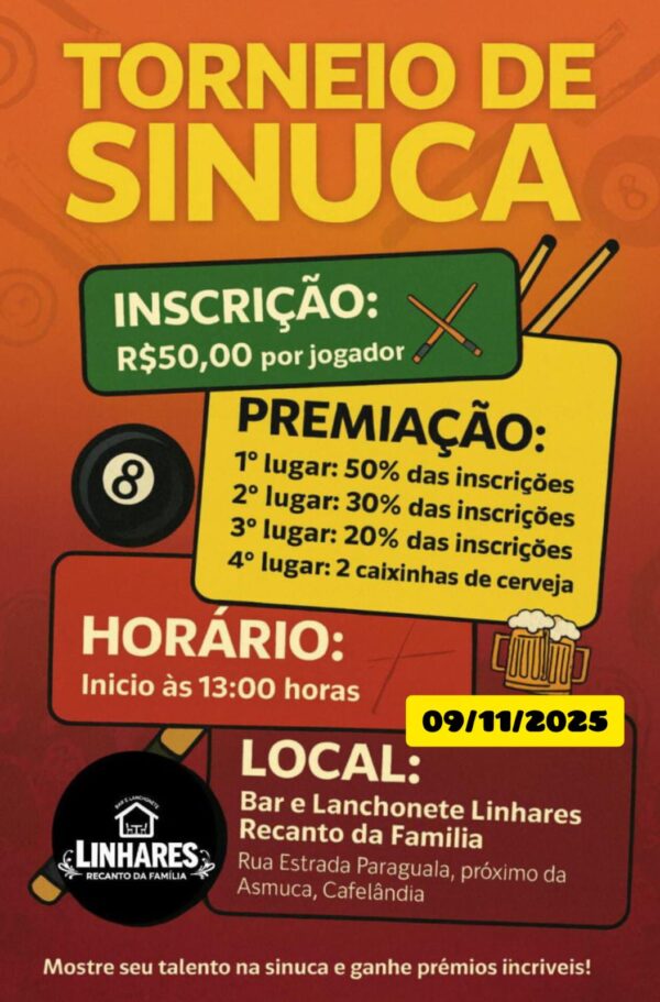 Atenção, amantes do sinuca! É com grande entusiasmo que anunciamos o **Torneio de Sinuca** que ocorrerá no **Bar e Lanchonete Linhares – Recanto...