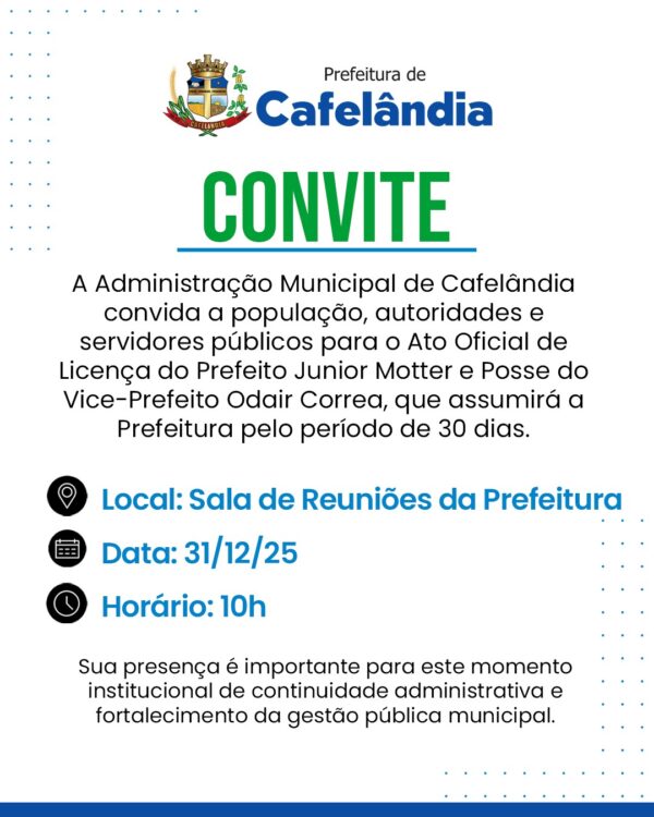 A Prefeitura de Cafelândia anunciou que o prefeito Junior Motter entrará em período de licença, e quem assumirá o comando do Executivo municipal...