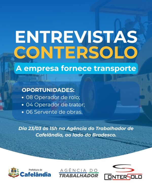 A empresa Contersolo está contratando para diversas vagas: são 8 vagas para operador de rolo, 4 para operador de trator e 6 para...