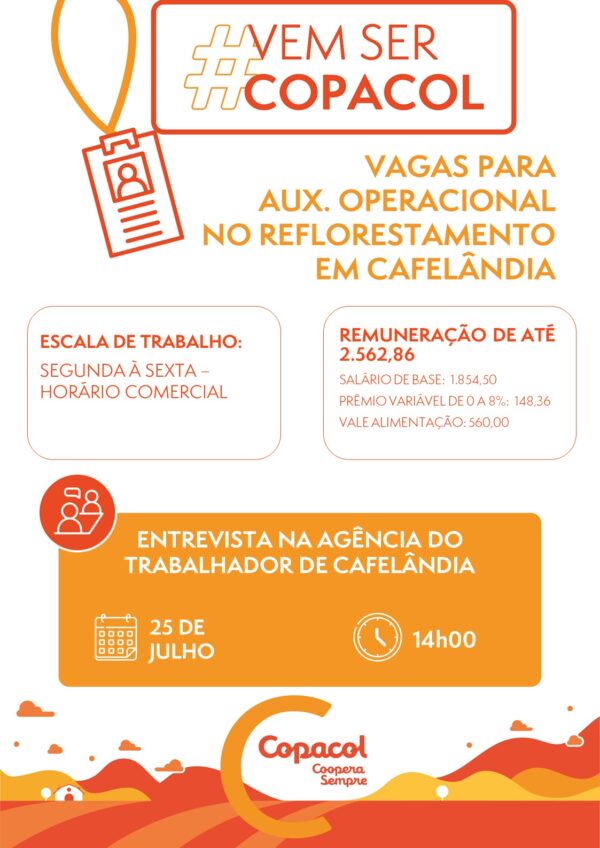 PorVinicius Cardoso30 de julho de 2024Entrevistas para áreas produtivas da Copacol para quinta-feira. Quem tiver interesse pode agendar sua entrevista pessoalmente ou pelo Whatsapp 45 3241-2050