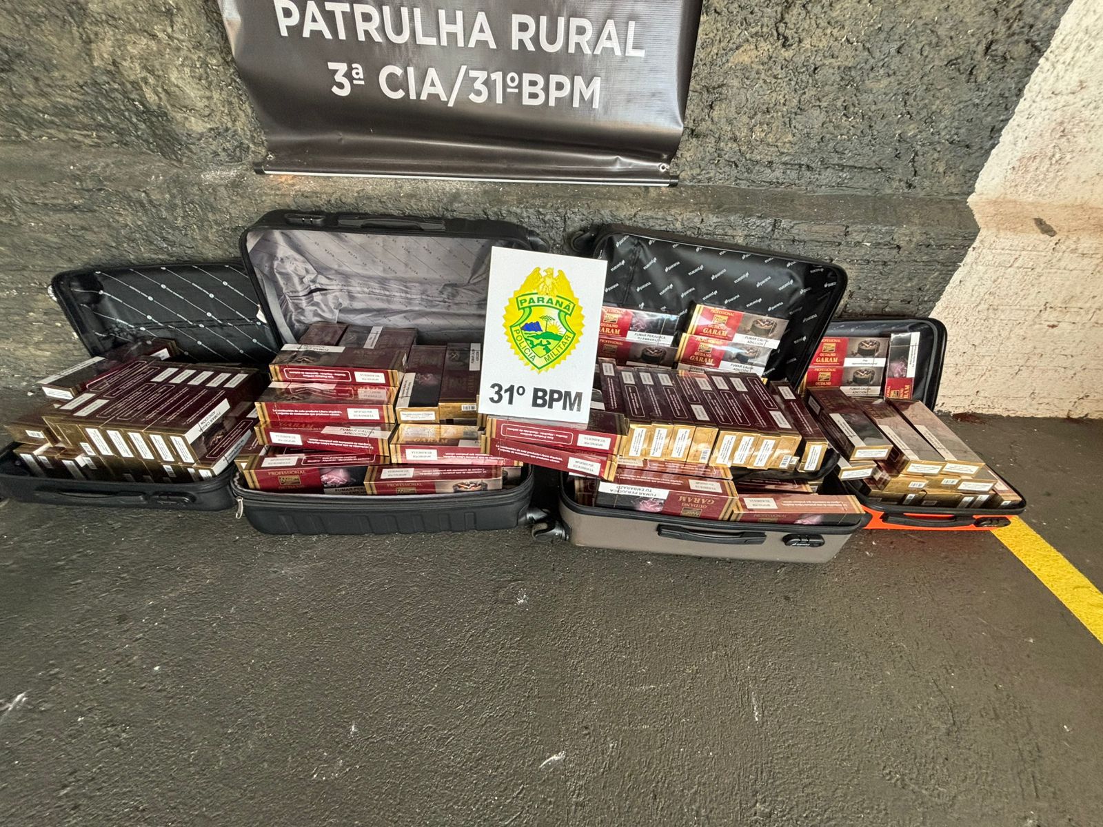Ao realizar abordagem a ônibus que passaram pelo local, logrou-se êxito em localizar 4 malas no compartimento de carga de um ônibus de linha, contendo cigarros oriundos do Paraguai.