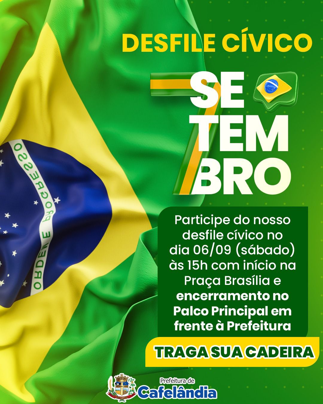 A Prefeitura de Cafelândia tem o prazer de convidar toda a população para um momento especial e marcante! Neste sábado, dia 06 de setembro, acontecerá um desfile cívico que promete reviver uma tradição que há tempos não era realizada em nossa cidade.