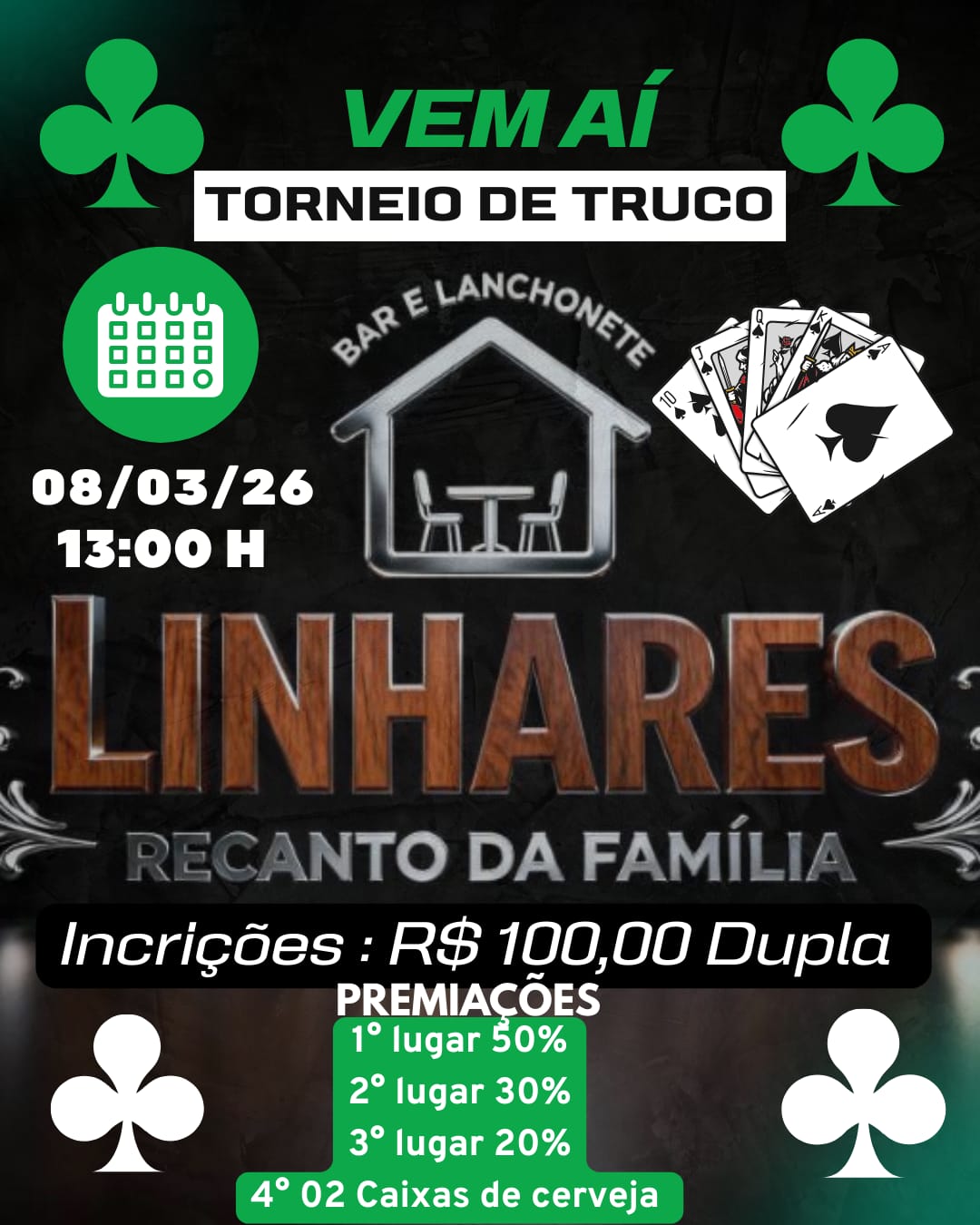 A direção do Bar e Lanchonete Linhares Recanto da Família de Cafelândia tem a satisfação de convidar todos para participar do nosso emocionante Torneio de Truco, que ocorrerá no domingo, dia 08 de março de 2026.