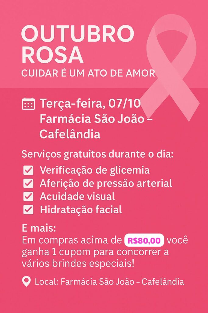 As novidades seguem o dia todo, para que você possa aproveitar e economizar. E na terça-feira amanhã dia 07,  terá uma ação Outubro rosa com acuidade visual e verificação de pressão para as mulheres participantes em compras acima de 80,00 reais ganha um cupom para concorrer prêmios.