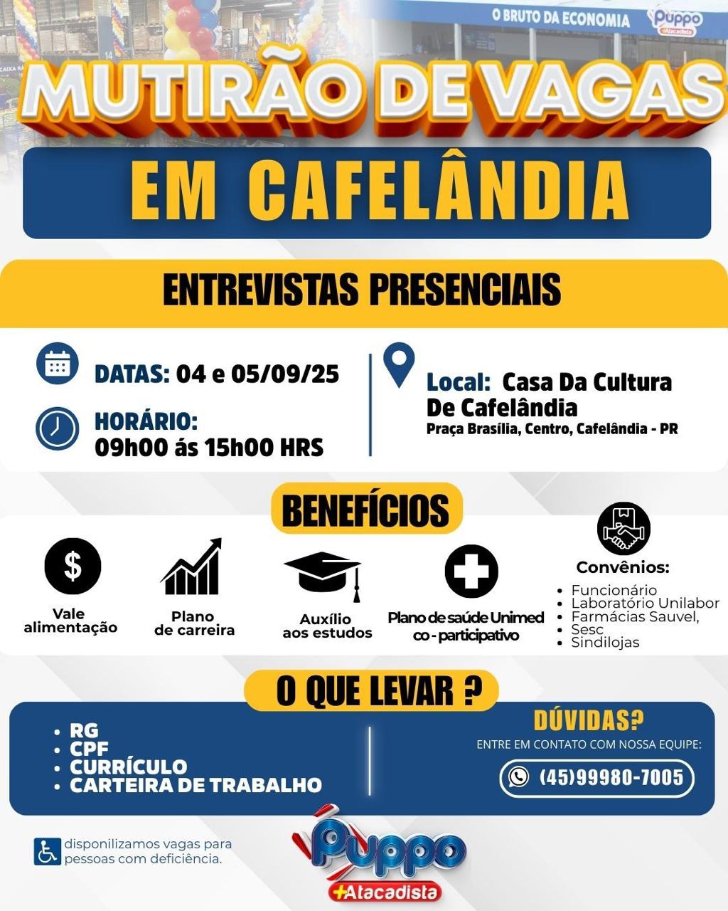 A oportunidade que você esperava chegou! Venha participar do Mutirão de Vagas do Puppo e garanta a chance de trabalhar nessa grande empresa da região! 👏