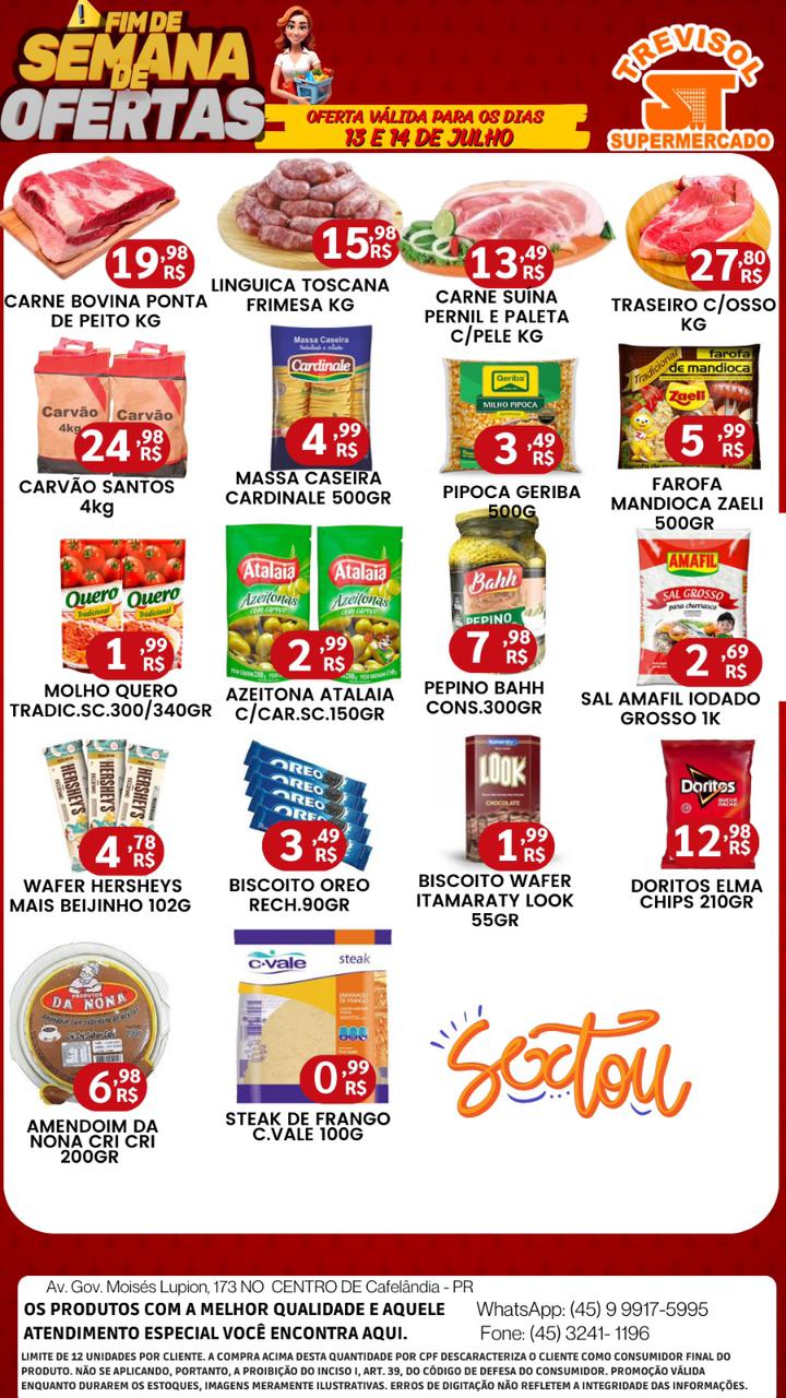 No Trevisol Supermercado você compra Carne bovina ponta de peito á 19,98 o quilo. Linguiça Toscana Frimesa á 15,98 o quilo. Carne Suína pernil e paleta com pele por apenas 13,49 o quilo. Traseiro com osso 27,80 o quilo. Carvão Santos, 4 quilos por apenas 24,98.