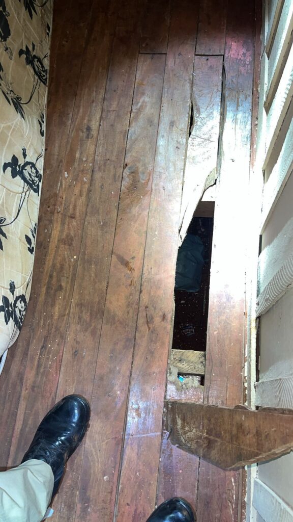 No outro quarto, ao movimentar a cama, foi localizado em baixo desta uma quantia de papel alumínio, a equipe notou também que o chão feito de madeira aparentava ter um fundo falso, com uma madeira solta, sendo esta retirada e localizado uma sacola com balança de precisão e um tablete de maconha.