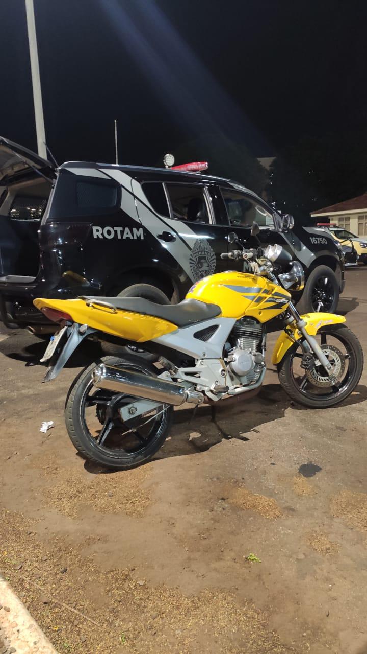 O condutor acatou a ordem policial, foi identificado, e em busca pessoal nada de lícito foi encontrado, ao consultar a motocicleta foi possível identificar uma HONDA/CBX 250 TWISTER de cor amarela placa de Santa Catarina, que após consulta estava com débitos e multas somando mais de 13 mil reais.