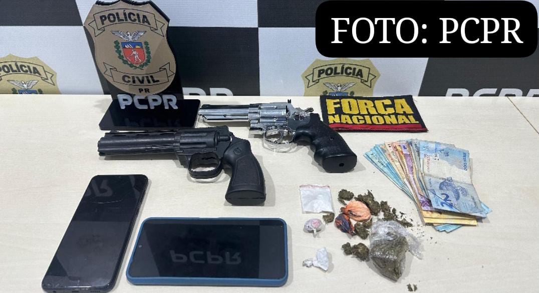 No imóvel, foram apreendidos dois simulacros de arma de fogo que eram usados para amaaçar a vítima. Além de cocaína, maconha, dinheiro em espécie e um celular.