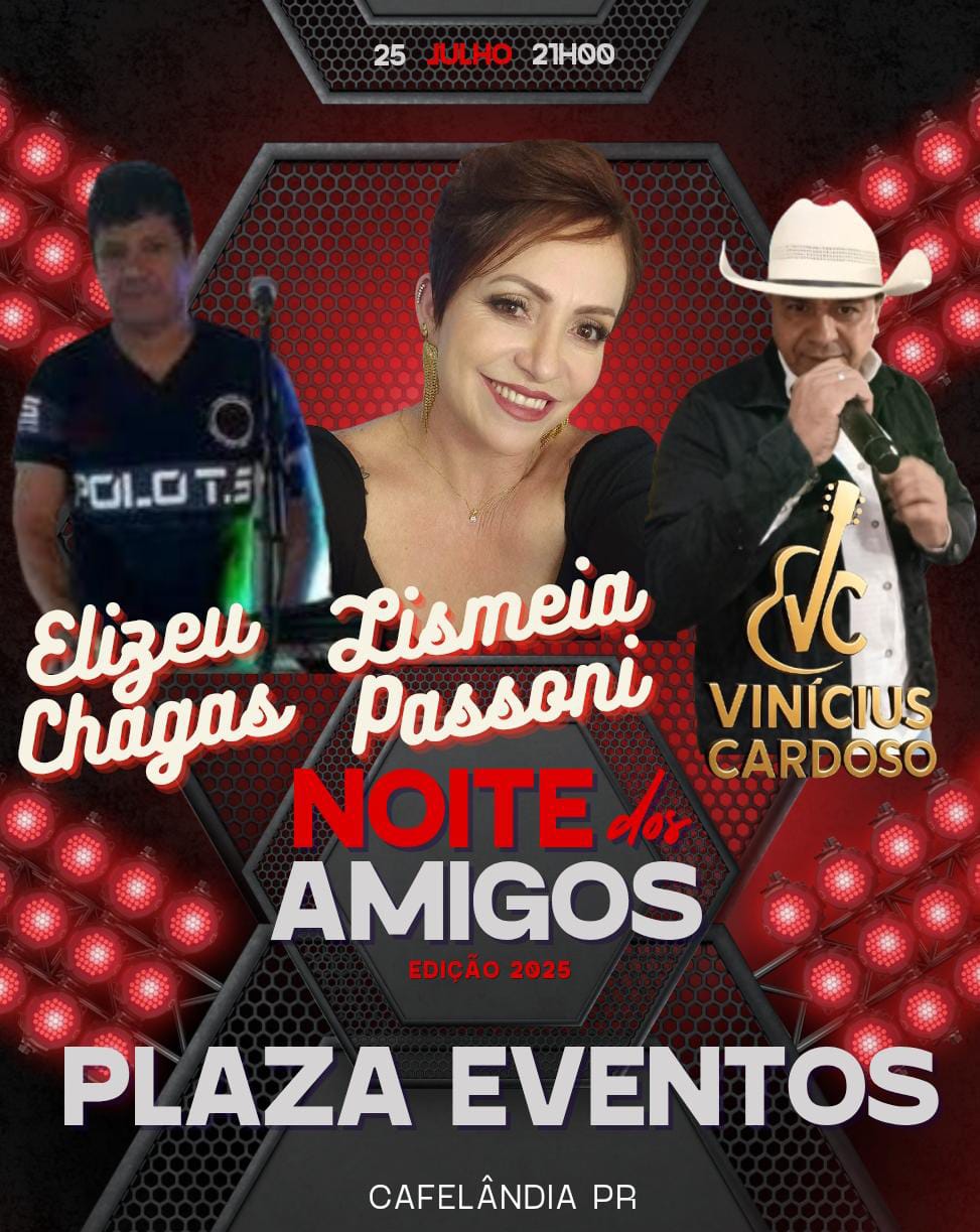 Nesta sexta-feira, dia 25 de julho, o Centro de Eventos de Cafelândia se transforma no palco da tradição e diversão com a **Noite dos Amigos**, um evento imperdível para os amantes do sertanejo. O Plaza Eventos irá receber três grandes atrações que prometem animar a sua noite: Lisméia Passoni, Elizeu Chagas e Vinícius Cardoso.