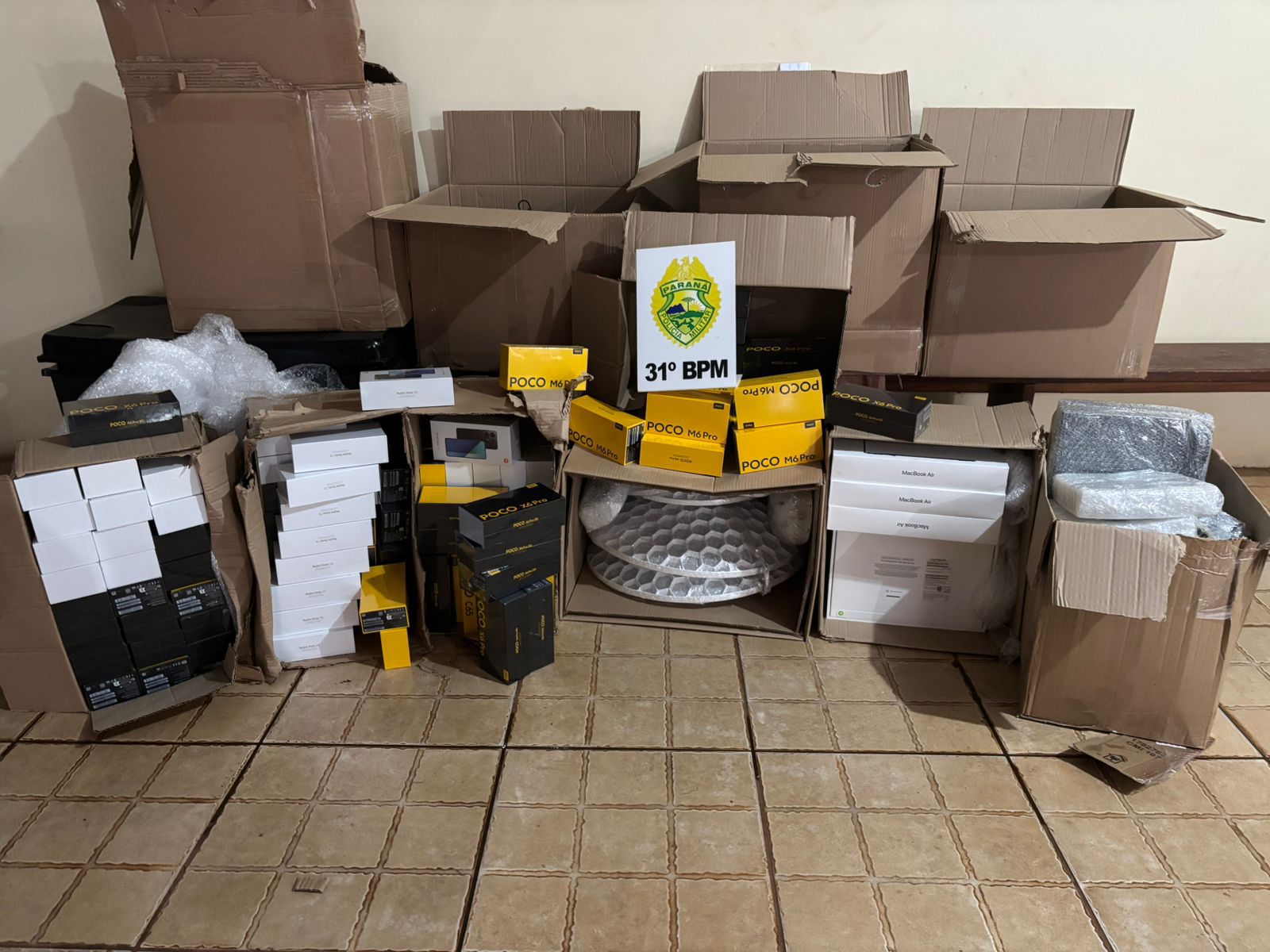 Aparelhos este celulares, notebooks e conector para internet fibra óptica, diante da constatação do descaminho o condutor juntamente com o veículo foi encaminhado até a Companhia para os procedimentos, sendo orientado pela Polícia Federal liberar o homem, apreender as mercadorias e o veículo e encaminhar a Receita Federal de Cascavel para os procedimentos.