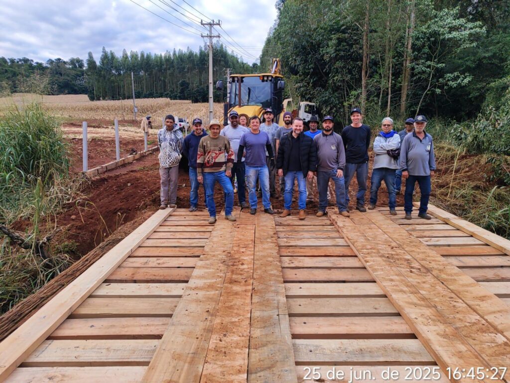 Após o término da obra, o prefeito Junior Motter, acompanhado do secretário de Agricultura, Viação e Obras, Valdecir Vizzoto, e do engenheiro agrônomo Rogério Schmidt, esteve no local para vistoriar e conferir de perto o resultado dos trabalhos “Essa ponte é fundamental para o escoamento da produção e o deslocamento das famílias que vivem nessa região.