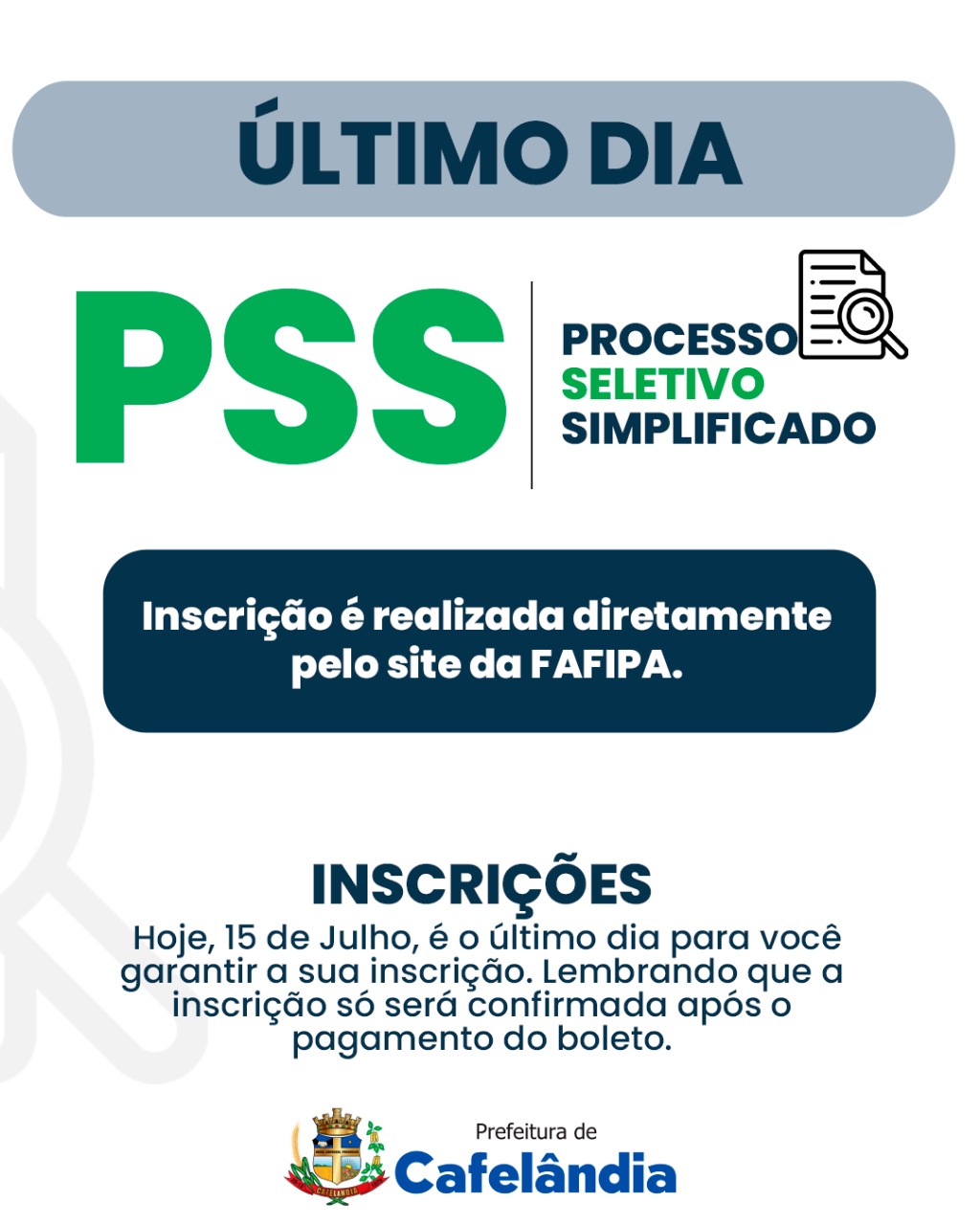 A Prefeitura de Cafelândia informa que hoje, 15, é o último dia para se inscrever no Processo Seletivo Simplificado (PSS) n.º 002/2025 e amanhã, 16, encerra-se o prazo para pagamento do boleto.