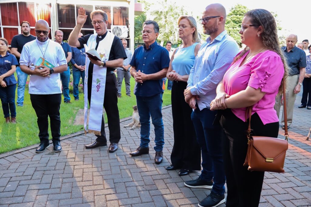 O início das atividades do prefeito Junior e Motter e seu vice Odair da farmácia foram precedidos por um momento de oração e bênçãos proferidas pelos padres Wilson e Marcelo.
