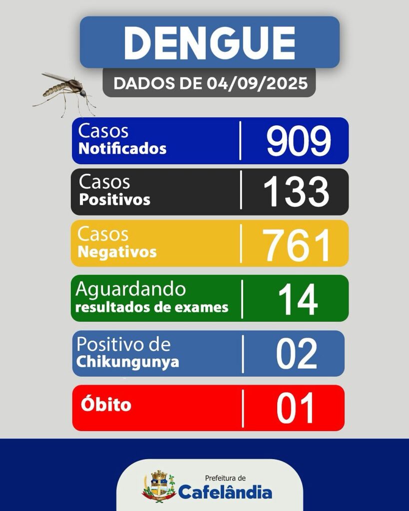 A Prefeitura de Cafelândia informa os dados atualizados sobre a situação da dengue no município. Até o momento, registramos um total de 150 casos confirmados da doença, com 10 hospitalizações recentemente.