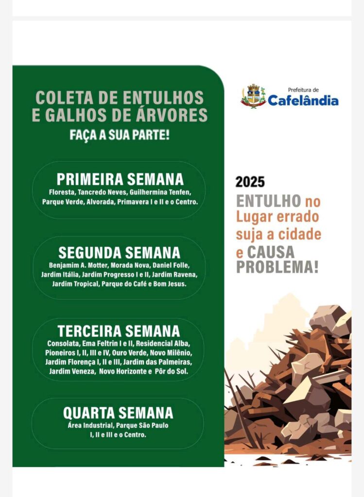 Para manter nossa cidade limpa e organizada, pedimos a colaboração de todos para colocar o lixo nos dias corretos, respeitando o novo cronograma. Juntos, podemos fazer de Cafelândia um lugar cada vez mais limpo e sustentável! 🌿