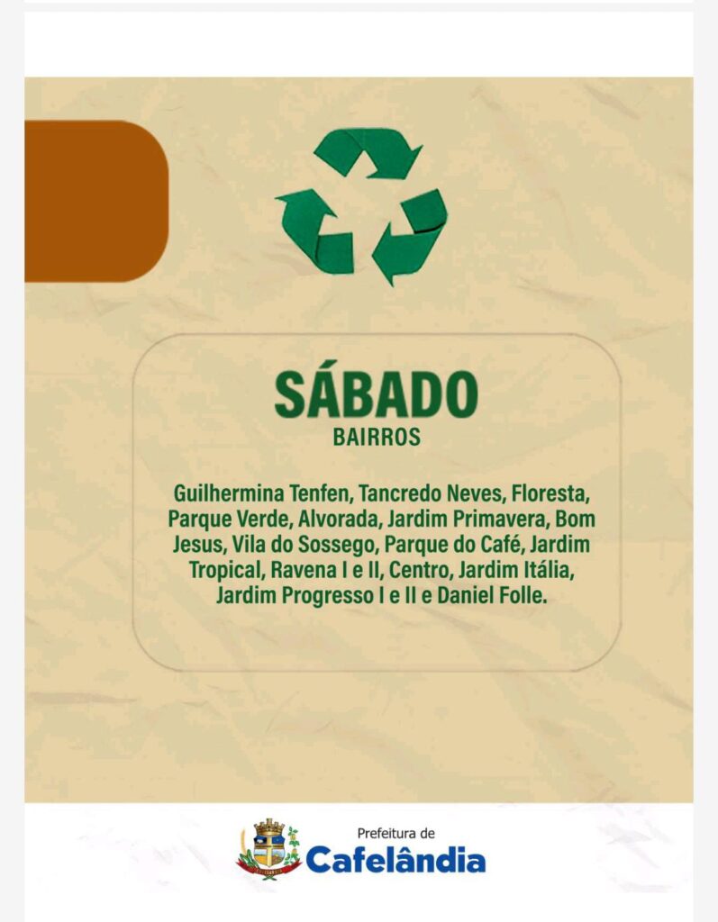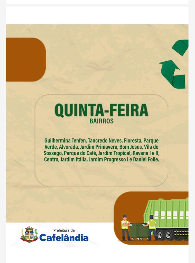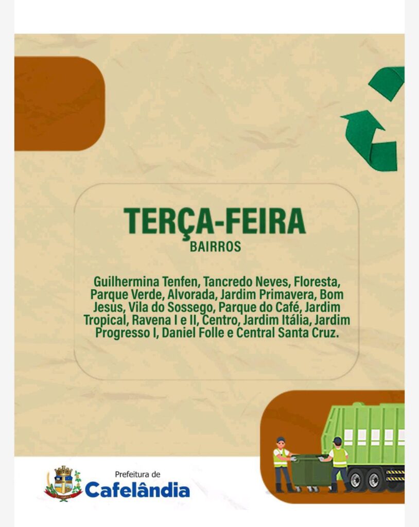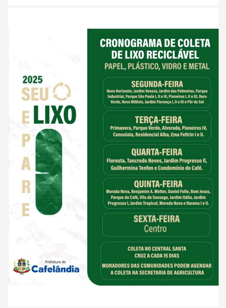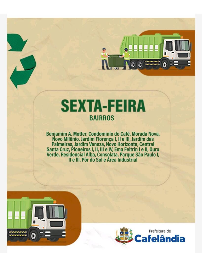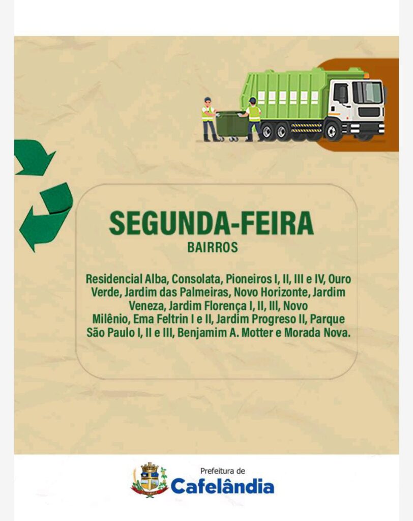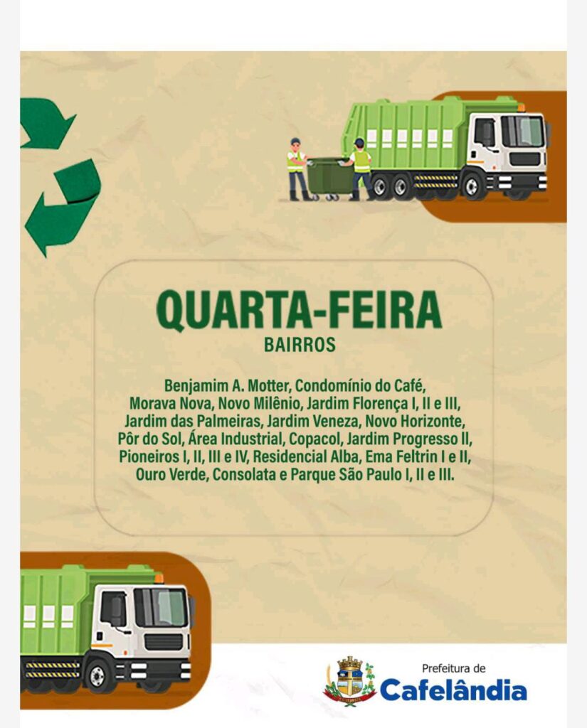 Para manter nossa cidade limpa e organizada, pedimos a colaboração de todos para colocar o lixo nos dias corretos, respeitando o novo cronograma. Juntos, podemos fazer de Cafelândia um lugar cada vez mais limpo e sustentável! 🌿