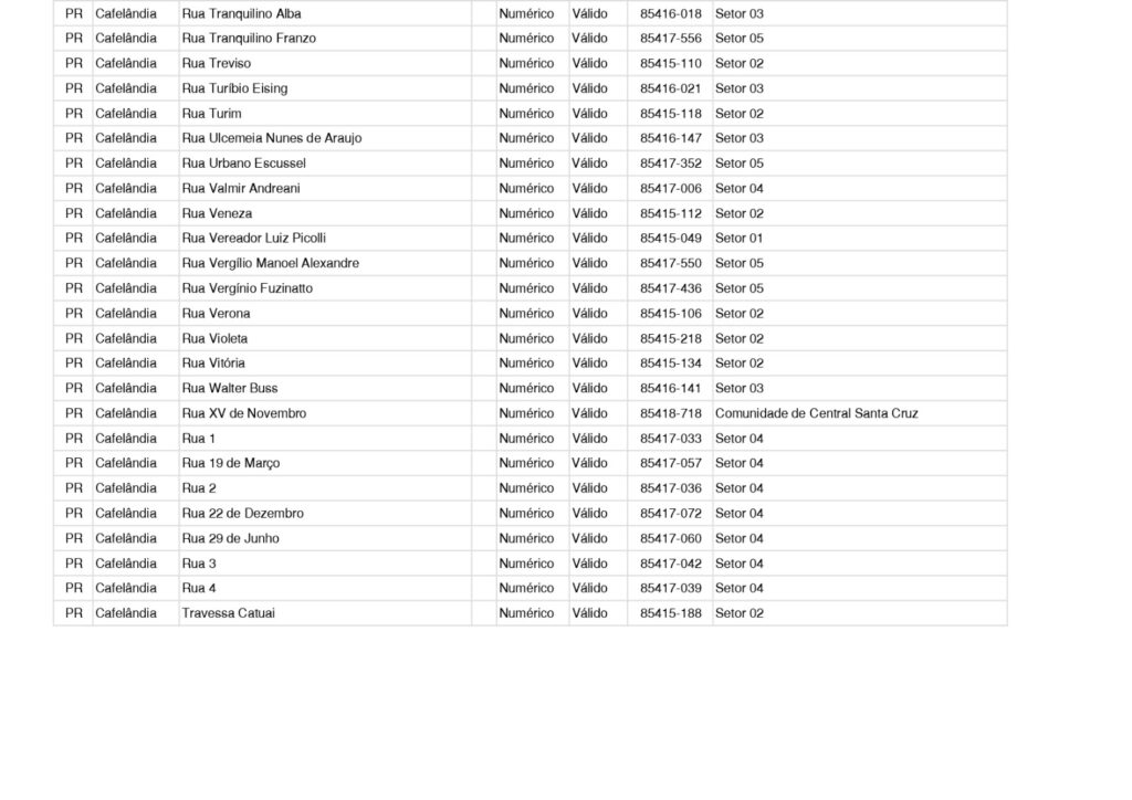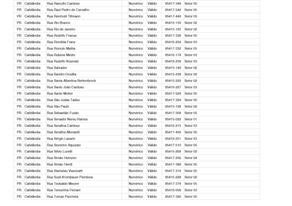 A Prefeitura de Cafelândia informa que os Correios implantaram um novo Código de Endereçamento Postal (CEP) no município. Até então, a cidade contava com um único CEP para todo o território, mas, a partir dessa determinação, o município passa CEPs diferentes, divididos por regiões, denominadas Setor 01 ao Setor 06, que serão organizadas conforme os bairros.