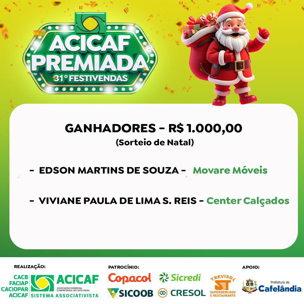 O resultado do penúltimo sorteio da campanha ACICAF PREMIADA está disponível. Os vale-compras do sorteio de NATAL contemplaram oito ganhadores (6 de R$ 500,00 e 2 de R$ 1.000,00).