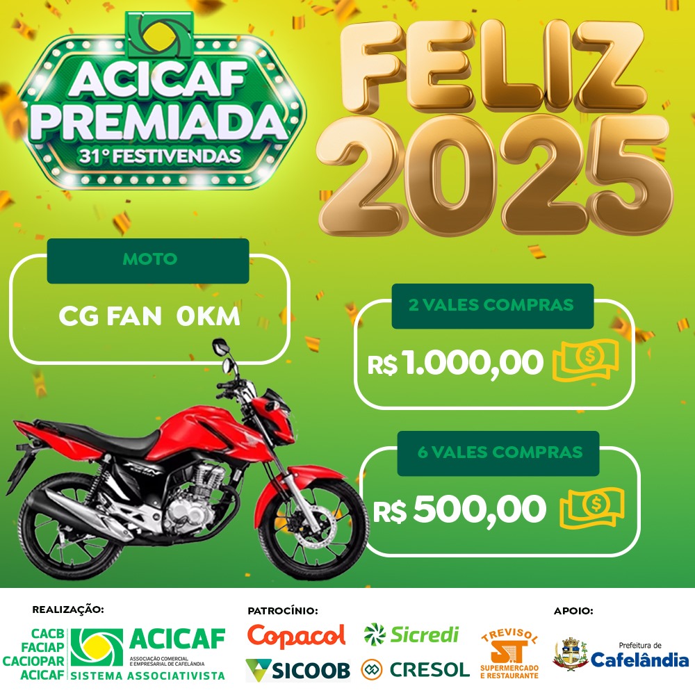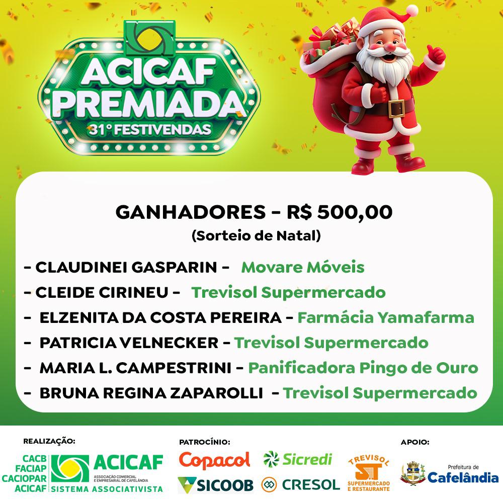 O resultado do penúltimo sorteio da campanha ACICAF PREMIADA está disponível. Os vale-compras do sorteio de NATAL contemplaram oito ganhadores (6 de R$ 500,00 e 2 de R$ 1.000,00).