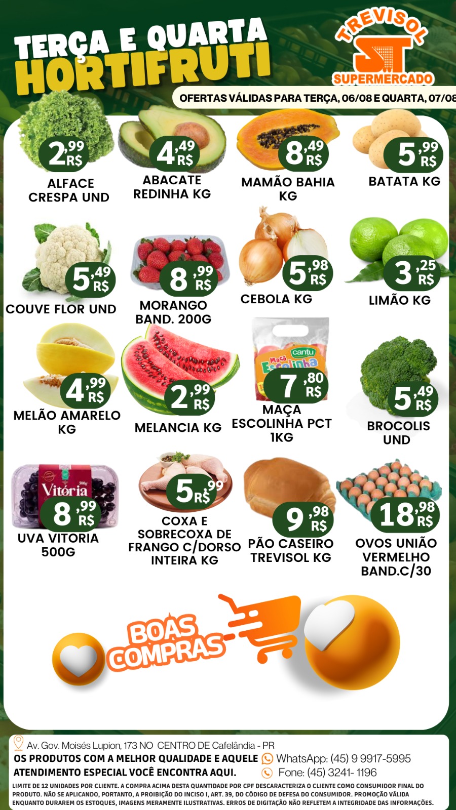 Aproveite as melhores ofertas no setor do Hortifruti do Trevisol Supermercado de Cafelândia. estamos localizados na Av. Governador Moisés Lupion bem no centro da cidade.