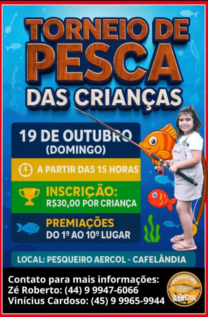 Informamos que o tão esperado Torneio de Pesca do Dia das Crianças, que estava agendado para o domingo, dia 12 de outubro, foi adiado e ocorrerá no próximo domingo, dia 19 de outubro. A alteração na data se deve às condições climáticas adversas, com previsão de tempo chuvoso.