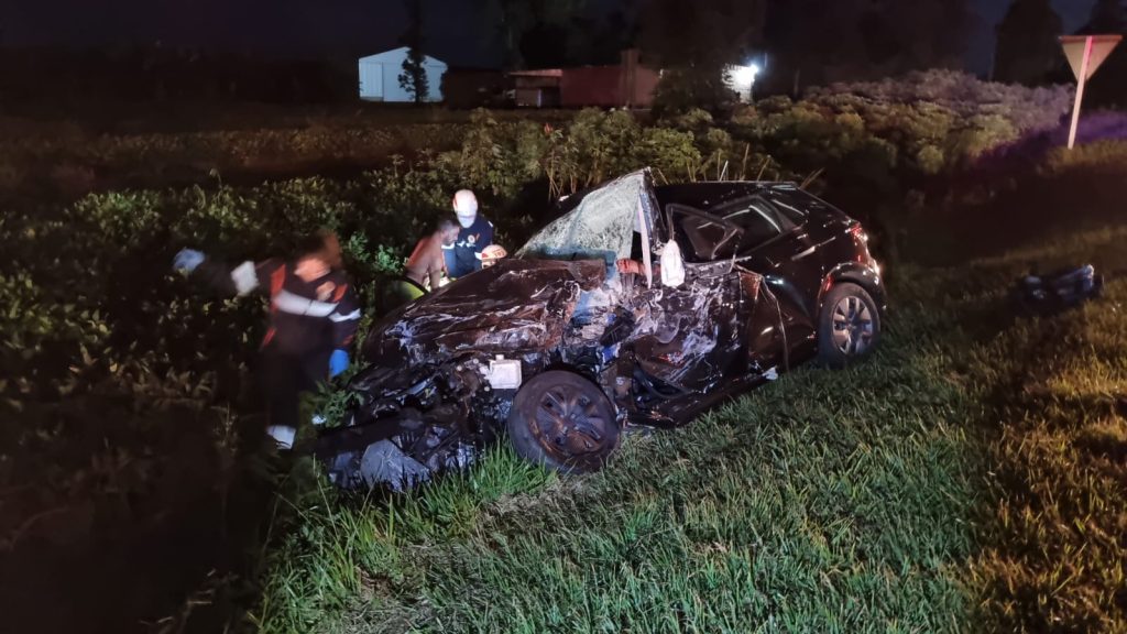 Já o carro, um Volkswagen Polo, foi parar no canteiro central, ficando completamente destruído, deixando o condutor preso às ferragens. Os socorristas precisaram usar ferramentas especiais para fazer o resgaste da vítima do automóvel, que apresentava ferimentos graves. Outro ocupante do carro conseguiu sair com a ajuda de populares e recebeu atendimento dos socorristas, com ferimentos moderados.