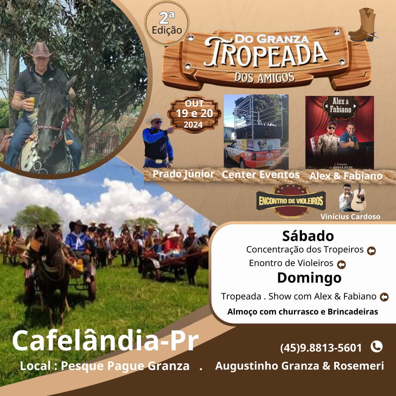 O evento irá começar no sábado dia 19 de outubro e terminará no domingo dia 20, no sábado haverá a concentração dos tropeiros que virão de toda a região, e a noite terá encontro de violeiros, com a participação do locutor Vinícius Cardoso.